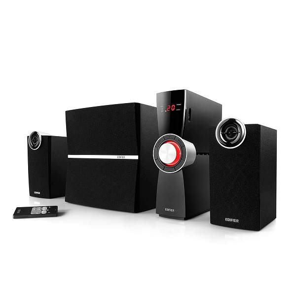 C2XD 2.1 speaker system with Edifiers signature distortion control technology. Independent amplifier with LED display, 3.5mm, Optical and RCA input options for connectivity, Edifier Electronic Intelligent Distortion Control (EIDC), IR remote control for easy adjustment